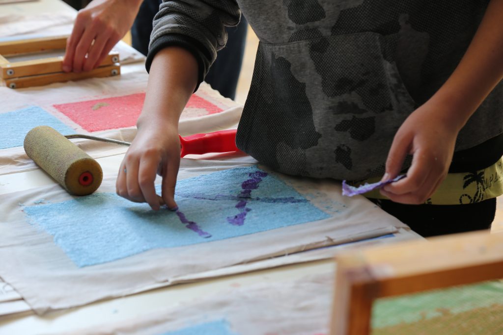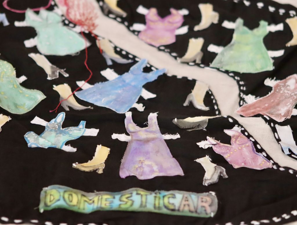 Mediación en torno a Colectiva Desbordadas, obra textil patrimonio UMCE. Actividad realizada por la egresada y docente Johane Bravo junto a estudiantes de 5to. básico a 3ero medio del taller